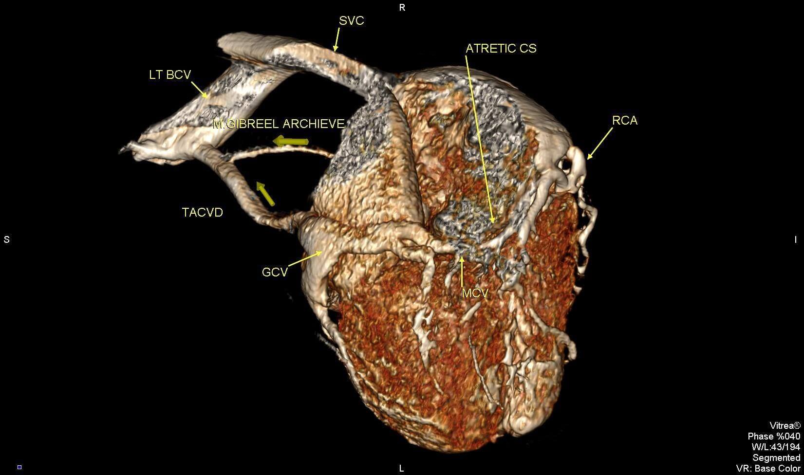 The middle & great cardiac veins (MCV & GCV) drain into a left sided vertical vein ( same course of persistent LSVC) to left BCV & also a vein draining the anterior wall of the RV ending into the left vertical vein . U must notify the surgeon this item so as not to ligate this thought persistent LSVC / vertical vein to any reason as in partial cavo-pulmonary connection (Glenn shunt) otherwise catastrophic sequale will happen.