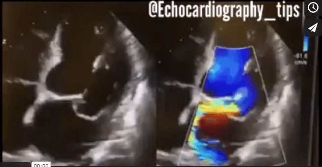 – Prolapso velo posterior con severa insuficiencia mitral( jet excentrico) atri izquierdo dilatado. FE parece normal en presencia del reflujo mitral.