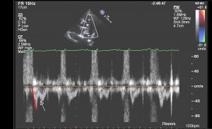 📷3️⃣: This pulsed wave Doppler shows several important features consistent with PHT. First the RVOT VTI is notched (white arrow), quite abnormal due to reflected waves that return during RV systole. Also note the steep acceleration time to peak velocity (red line), 60ms in this individual (<80ms in this context goes along with high PA pressures).