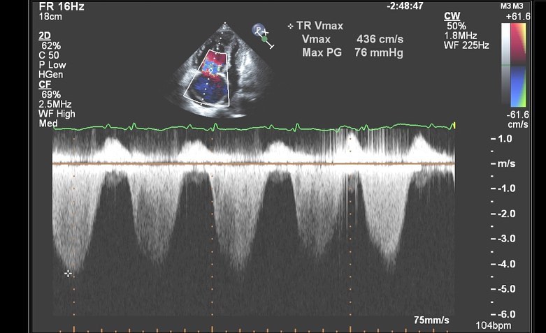 📷6️⃣: CW Doppler shows a thick dense TR jet. The estimated PA systolic pressure is markedly elevated. Adding on an RA pressure of 15, which this individual had, yields a PA systolic pressure of nearly 90 mmHg.