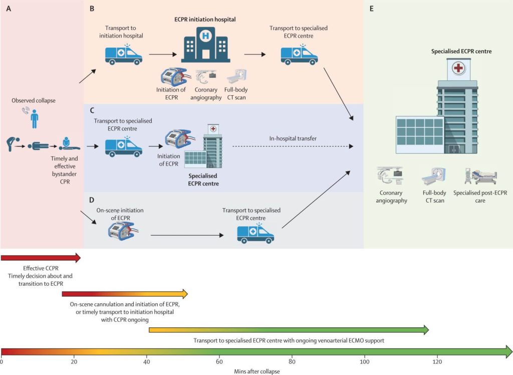If cardiac arrest is considered refractory to CCPR, early decision for transition to ECPR should be made, and further steps should be initiated according to local system organisation aiming at establishment of ECPR (ie, circuit connected to the patient circulation and running) within 60 mins after cardiac arrest (B–D). (A) Timely recognition of cardiac arrest and effective bystander CPR, and timely decision about initiation of ECPR and activation of ECPR team. (B) Early transport with ongoing effective CCPR to initiation hospital for initiation of ECPR. With ongoing venoarterial ECMO support, depending on local conditions and availability, coronary angiography or full-body CT, or both, can be performed in initiation hospital before transport of the patient to the specialised ECPR centre for specialised post-ECPR ICU care. (C) Early transport with ongoing effective CCPR to specialised ECPR centre, if this is the nearest place for in-hospital ECPR initiation. (D) On-scene initiation of ECPR, with ongoing venoarterial ECMO support and transport of the patient to specialised ECPR centre. (E) With ongoing venoarterial ECMO support, coronary angiography (if indicated) or full-body CT, or both, should be performed before in-hospital transfer of the patient to specialised post-ECPR ICU care. CPR=cardiopulmonary resuscitation. CCPR=conventional CPR. ECPR=extracorporeal CPR. ICU=intensive-care unit.