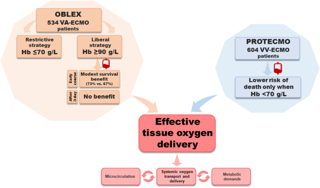 - Evidence for transfusion thresholds in VA-ECMO is weak: early observational data (OBLEX) suggested benefit from higher Hb, but this disappeared over time and is likely confounded.