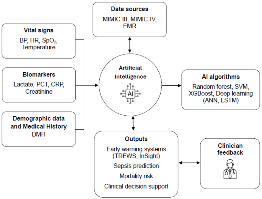 Sepsis, one of the leading causes of ICU mortality worldwide, remains a diagnostic and therapeutic challenge due to its nonspecific presentation and rapidly evolving course. In this narrative review, Tocu and colleagues explore the emerging role of artificial intelligence (AI) in diagnosing and predicting sepsis. Drawing from 45 studies between 2016 and 2024, the review highlights the performance of machine learning (ML) and deep learning (DL) algorithms—many achieving AUC values above 0.90—for early recognition and mortality prediction. AI tools like TREWS and InSight have demonstrated real-world success in reducing time to treatment and mortality. However, persistent barriers include limited transparency, inconsistent data quality, and the need for multicenter validation before widespread adoption.
