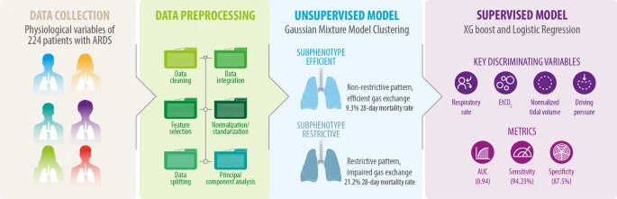 Summary of Machine learning-based identification of efficient and restrictive physiological subphenotypes in acute respiratory distress syndrome (Meza-Fuentes et al.) Abstract Summary: Meza-Fuentes et al. utilized advanced machine learning methodologies to categorize Acute Respiratory Distress Syndrome (ARDS) into two distinct physiological subphenotypes: Efficient and Restrictive. By analyzing ventilatory mechanics and gas exchange parameters collected within the