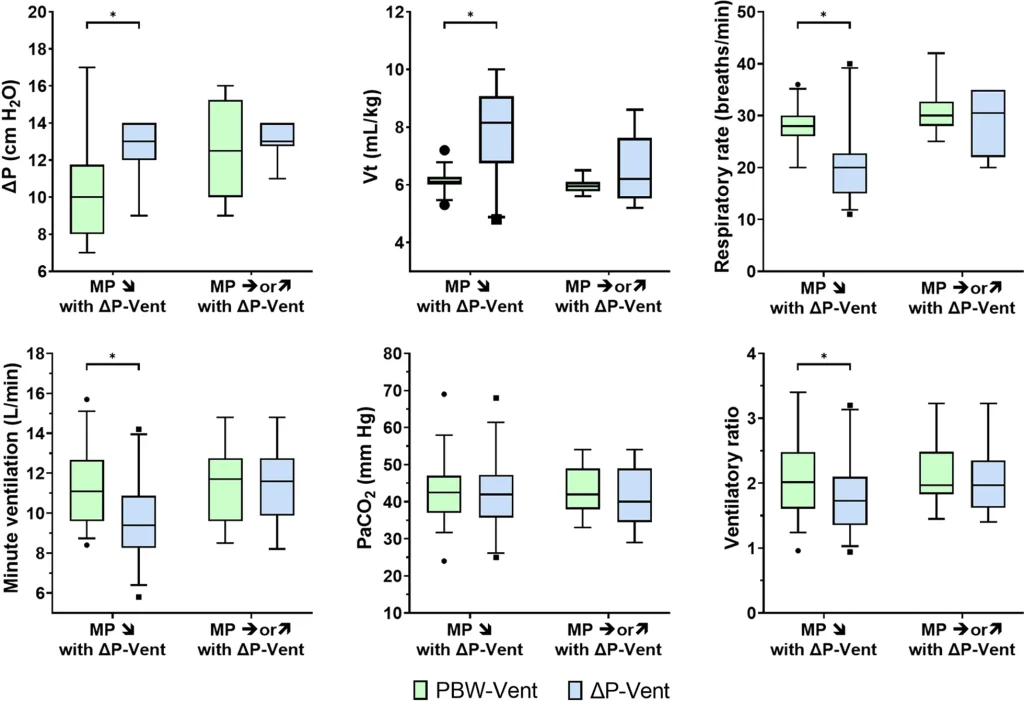 Summary of Driving Pressure-Guided Ventilation Decreases the Mechanical Power Compared to Predicted Body Weight-Guided Ventilation in the Acute Respiratory Distress Syndrome (Haudebourg et al.) Abstract Summary: Haudebourg et al. investigated the impact of driving pressure (ΔP)-guided ventilation versus predicted body weight (PBW)-guided ventilation on mechanical power in moderate-to-severe acute respiratory distress syndrome (ARDS) patients. Their