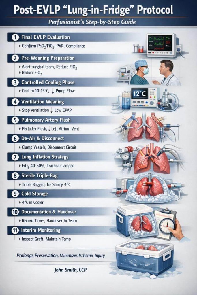This technique allows safe transition back to cold preservation after EVLP, optimizing logistics while minimizing ischemia–reperfusion injury and preserving graft quality.