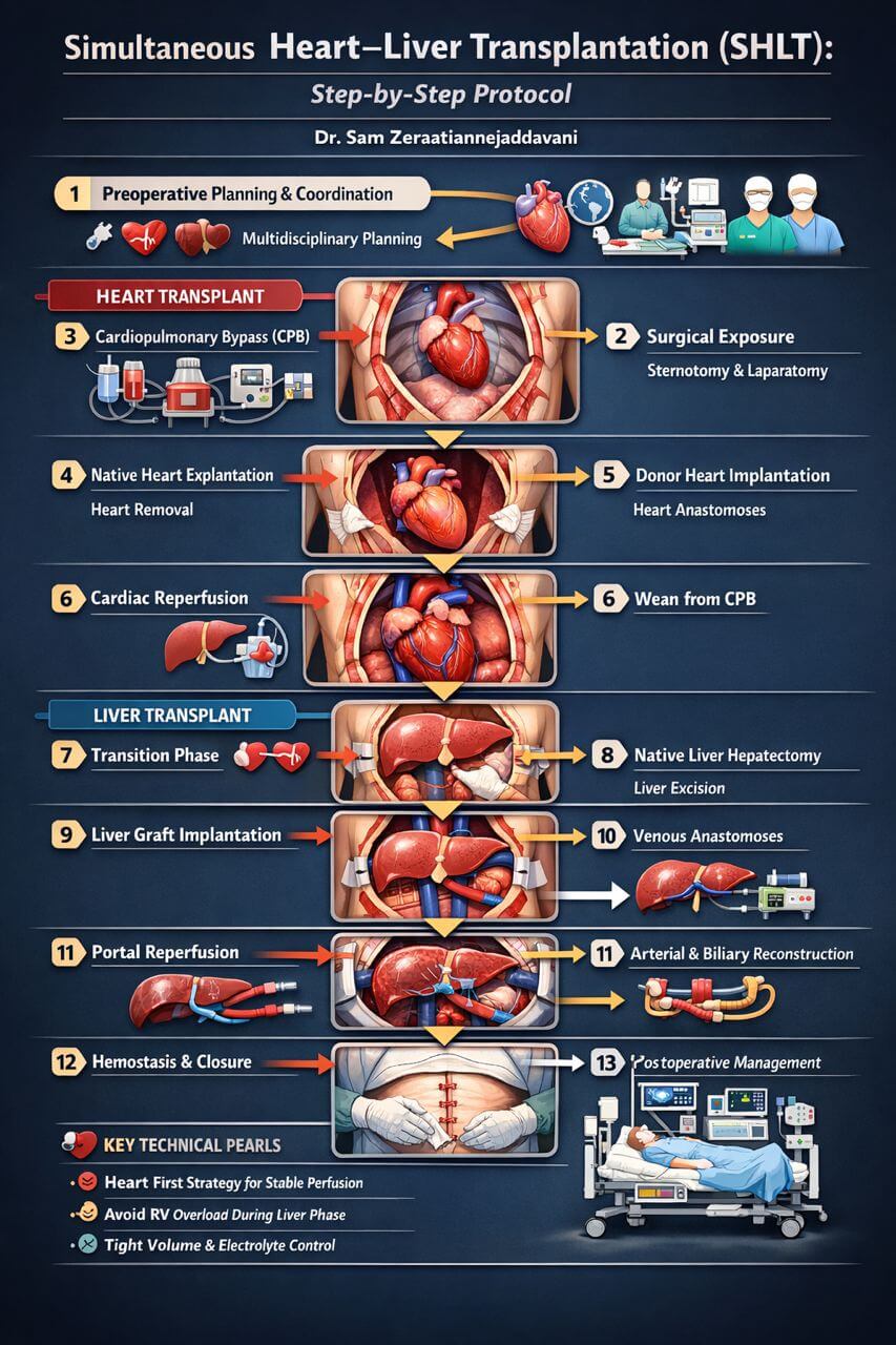 •Heart-first strategy → ensures stable perfusion for liver graft