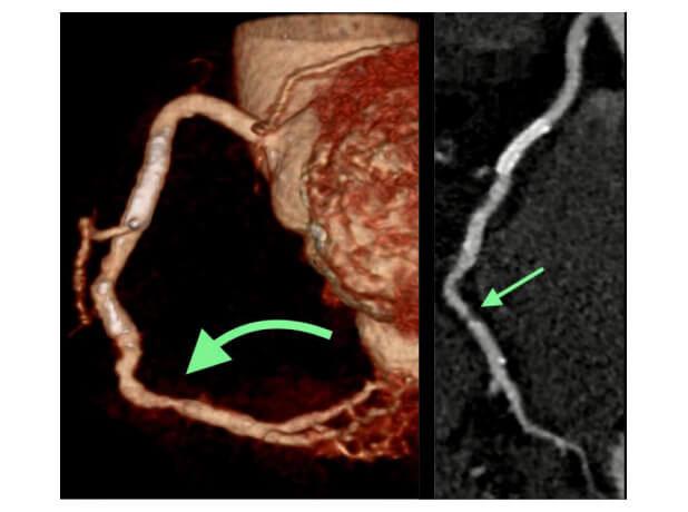 Coronary CT Angiography shows patent stent of the intermediate segment and high grade stenosis of the distal segment of the Right Coronary Artery.