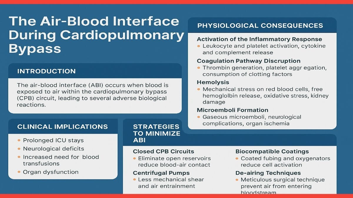 Conclusion: The air-blood interface presents a significant pathophysiological challenge in cardiopulmonary bypass. It incites a series of deleterious responses that can significantly affect patient outcomes. Reducing ABI through technical innovation, refined surgical techniques, and adherence to perfusion best practices is critical to improving the safety and efficacy of CPB. Ongoing research is necessary to develop and validate new strategies for mitigating ABI and improving long-term patient outcomes.
